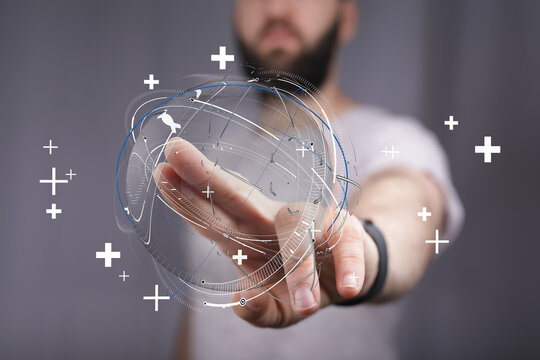 A man's hand reaches out to touch a digital globe, symbolizing global connection and technological advancement. A modern business concept with d