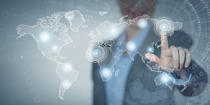 Global Connection: A person is working on a laptop with a holographic projection of the world map and location pins, illustrating the concept of global network, technology, and worldwide reach.