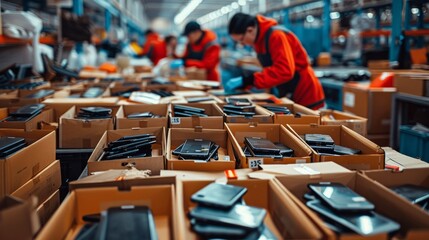 Amid the factory's controlled chaos, a team of skilled workers orchestrates the seamless production, sorting, and packaging of state-of-the-art smartphones for worldwide distribution.