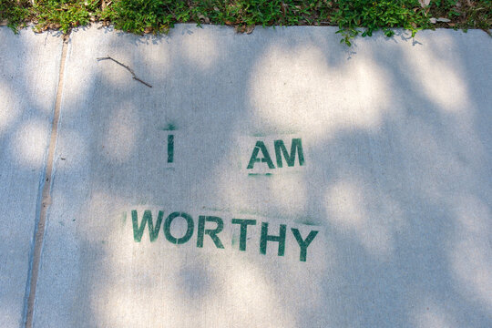 Chunky glowing message you are still worthy in white and gold mounted above window full of condensation in old quiet kitchen