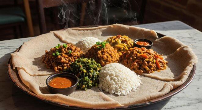 A Traditional Ethiopian Communal Feast on an Injera Platter