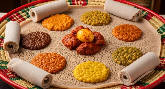 Editorial shot of injera with colorful wot stews on traditional plate
