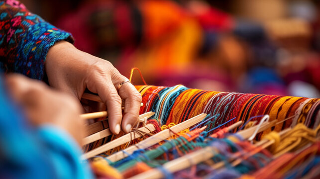 A close-up of hands expertly weaving a colorful ethnic folk rug, Ethnic Folk, blurred background