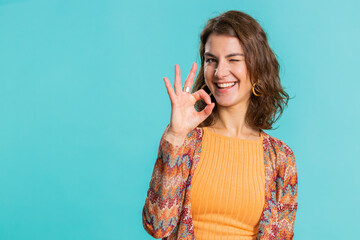 Okay. Joyful happy young woman looking approvingly at camera showing approve feedback gesture like Ok sign positive something good. Pretty girl isolated on blue background. People sincere emotion