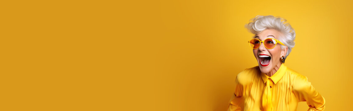 Excited, shock, omg wow expression. Shocked surprised senior old female woman lady on yellow background. Copy paste empty place for text