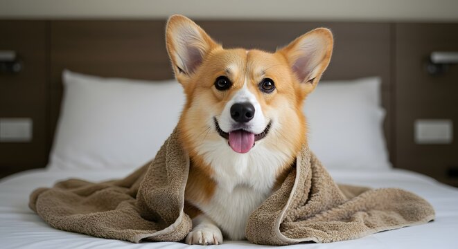Adorable Corgi dog wrapped in a cozy towel on a bed, looking happy and relaxed