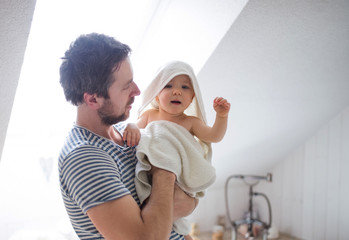 Father with a toddler child wrapped in towel in a bathroom at home.