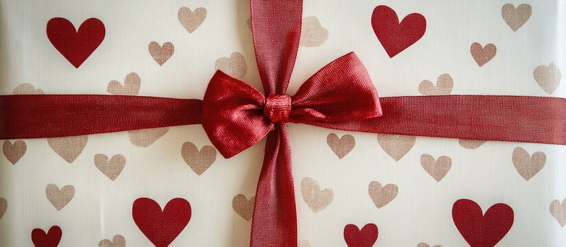 Eco friendly recycled wrapping paper adorned with red heart motifs and elegant cotton ribbon for sustainable gift packaging