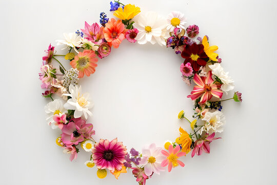 Wild flower frame on white background with copy space. Minimalist floral wreath aesthetic.