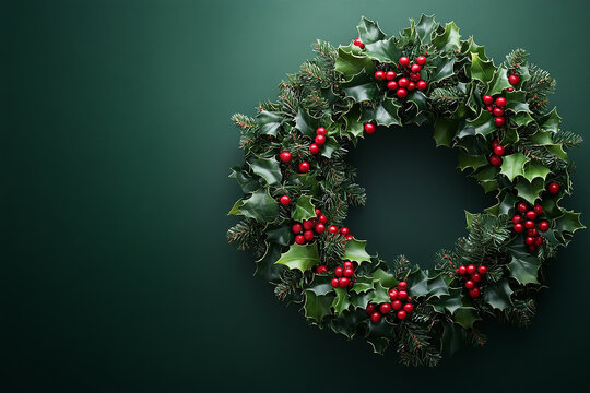 Watercolor holly wreath and sprigs seamless pattern with red berries on white holiday decor