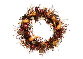Studio shot of wreath made of spruce, juniper, ivy and rose hips