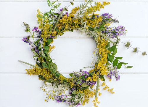wreath of wild flowers. yellow and purple wildflowers on a white wooden background