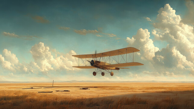Celebrating the first flight of the Wright brothers over open fields with a historic aircraft soaring gracefully in the sky