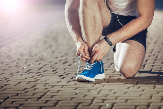 Close up of well shaped sprinter bending and fixing shoelaces of his snickers. He is kneeling while listening to music outside. Copy space in left side