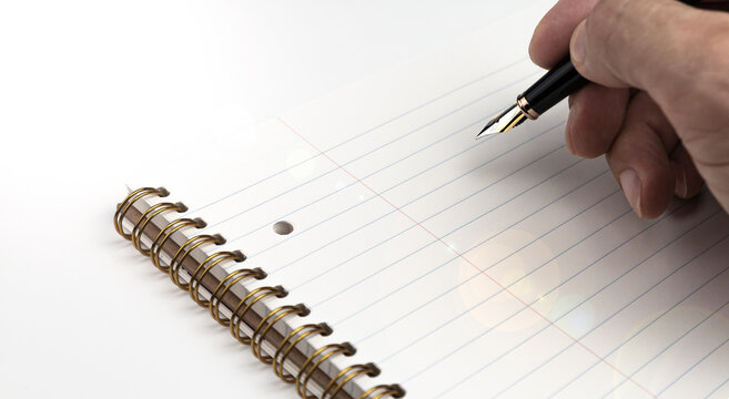 A man's hand holding a fountain pen riting down on notepad