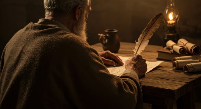 Young woman writing late-night journal by warm lamplight with coffee on wooden desk