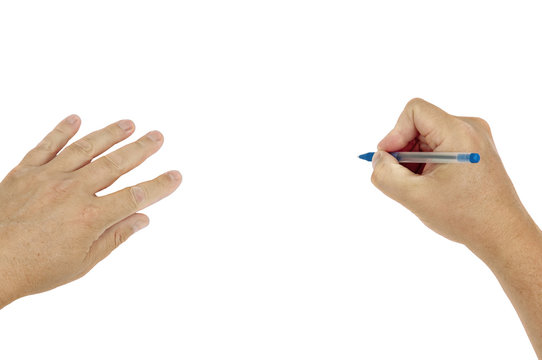Hands writing on a blank white background with clipping path