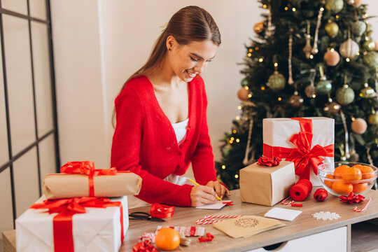 Woman Writing Holiday Cards at Gift Wrapping Station