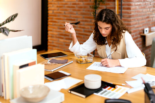 flatlay of home office or working space with notebook, book, cup of tea and cookies. draft paper on the background. working or thinking process concept
