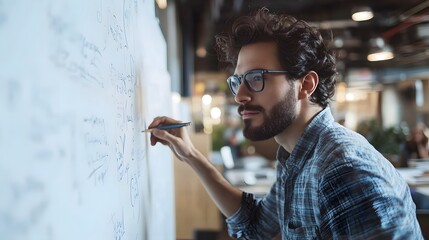 A man writing equations on a whiteboard in an office