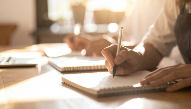 Close-up shot of individuals taking notes during a meeting.