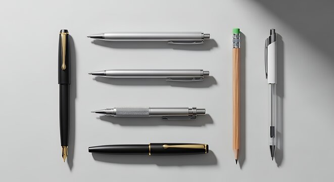 Assortment of professional writing instruments, including fountain pens, ballpoint pens, and pencils, on a clean grey background in a minimalist flat lay.