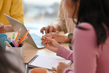 Cropped view businesspeople' hand working on notes and a laptop and having a meeting together, for business and technology concept.