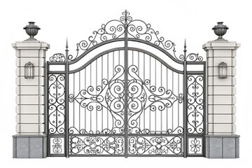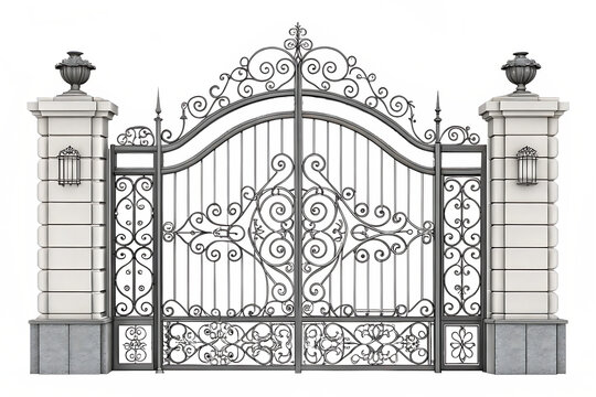 Golden merry christmas sign decorating ornate wrought-iron gate with floral scrollwork