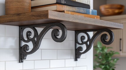 Elegant wrought iron shelf bracket supporting a wooden shelf with decorative books in warm tones