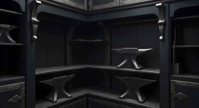 Unique Blacksmith Inspired Closet With Anvil Shelves And Wrought Iron Details