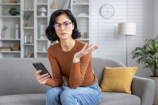 Confused woman receiving bad news via text message