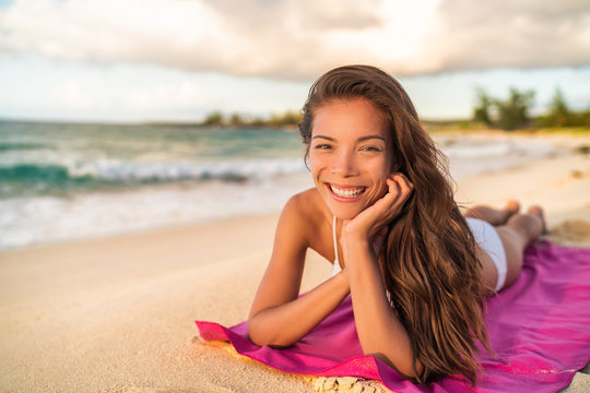 Happy Asian bikini wwoman model relaxing on summer vacation lying on beach towel, Hawaii travel.