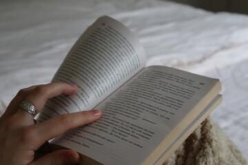 Wwoman's hands in a sports jacket hold a blank notebook on beige background.