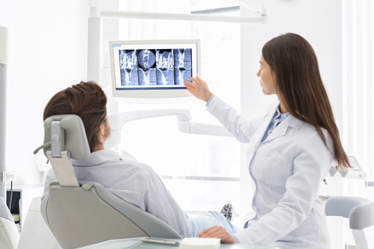 Pretty female dentist explaining her patient in chair x-ray results