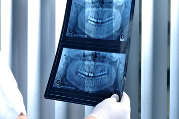 Female doctor analyzing spinal x-ray in clinic during consultation