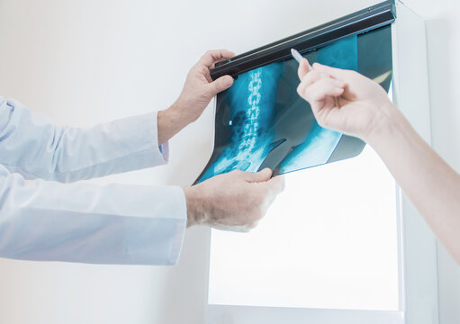 Scoliosis spine watching image of chest at x-ray film viewer