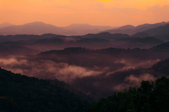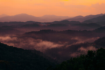 Glowing sunset sky and silhouetted mountainous landscape near Xiang Khuan mountain viewpoint in Laos; Ban Poung, Laos