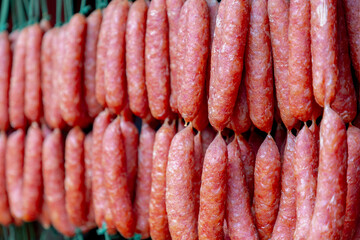 Selective focus of Guang Xiang hanging on the rail display on market stall, Kun chiang is a sweet and dried Chinese sausages, The sinosphere or the Chinese, Chinatown street food, Bangkok, Thailand.