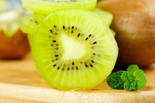 Fresh Green Kiwifruit Cross Section with Seeds and Mint