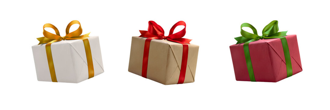 A collection of white, red and brown gift wrapped presents with a red , gold and green ribbon bows isolated against a transparent background.