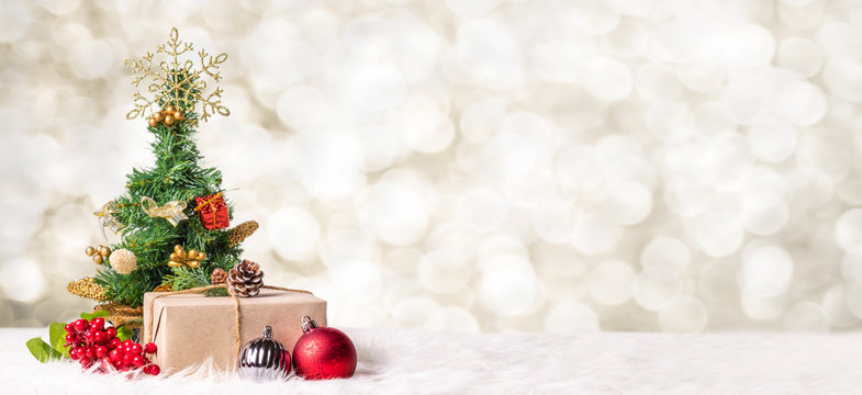 Christmas tree and gift box at blur bokeh light background,Winter holiday banner greeting card.