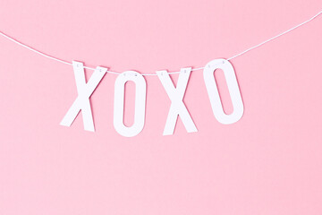 a friendship and love expression XO, XO a common frase of crude wooden letters at lower left corner, one letter overlaping the other on white and text space, minimalistic valentines day