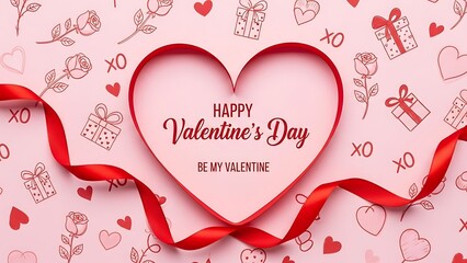 Romantic Valentine's Day Background with Red Silk Ribbon Heart and Pink Illustrated Pattern