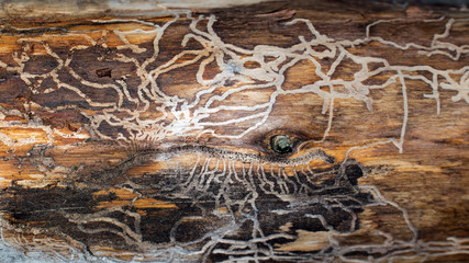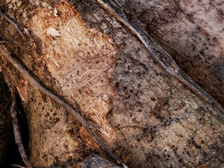 Traces from the boring of wood eating larvae under the bark of a pine tree. The eggs has hatched and the larvae has eaten away outwards from the main burrow.