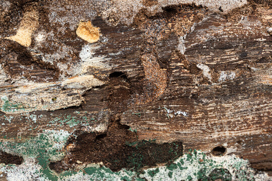 Termites Devouring Wood Close Up Showcasing Tunnels and Damage in Dark Brown Texture