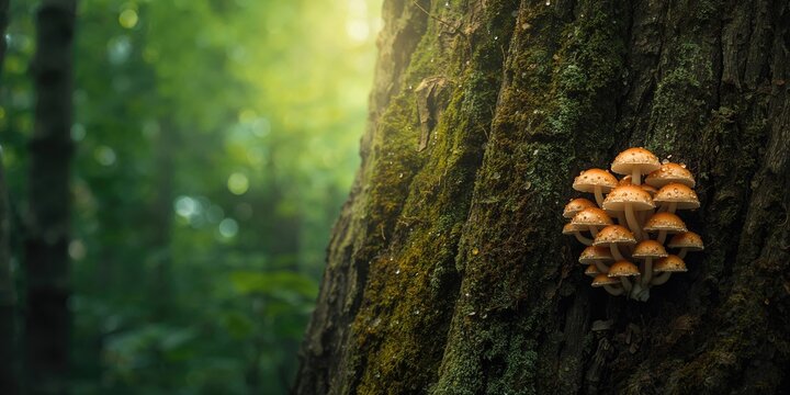 Xylophagous mushrooms growing on tree in forest setting, natural decay process, Earth Day