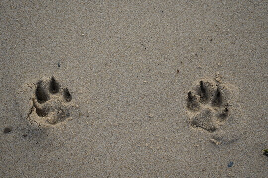 Dog (Canidae) footprints on the beach in Porto, Portugal.