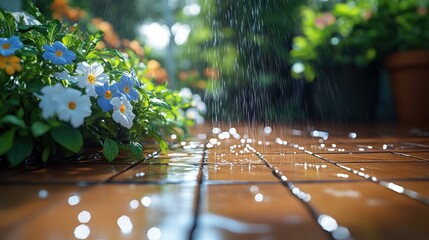 Pressure Washer Clean Up of Dirty Backyard Patio with Vibrant Flowers in Spring