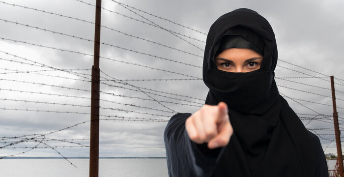 migration crisis, freedom and security concept - woman in hijab pointing finger to camera sign over barbed wire fence background