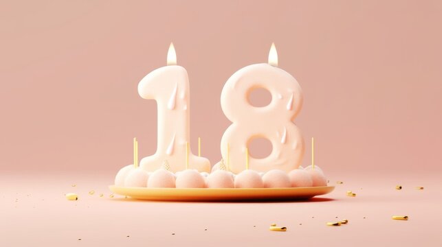 number 18 candle on a eighteenth year birthday cake celebration with balloons and party decoration as banner